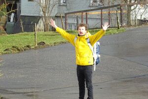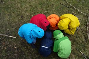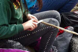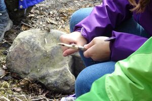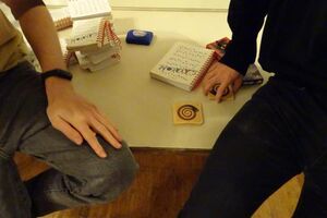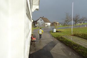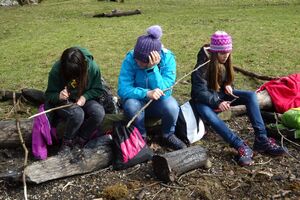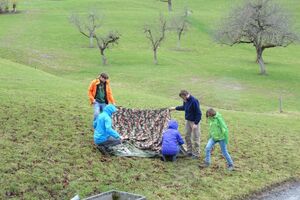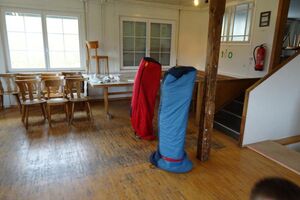 Danach machten wir uns angesichts des nahenden Regens auf den Weg zurück zum Haus. Während wir drinnen ein Riesenleiterlispiel spielten, begann es draussen zu regnen. Danach stellten wir ein Minileiterlispiel für unsere Kluft her, das uns ab jetzt an dieses Wochenende erinnern soll.